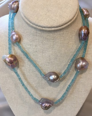 14mm – 17mm Cultured White Baroque Fresh Water Pearl & Larimar Bead Necklace