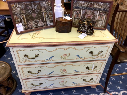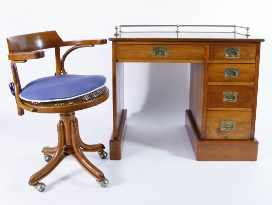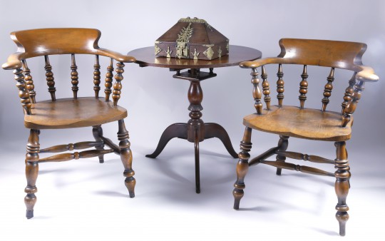 Pair of 19th C. Windsor Captain’s Chairs, Mahogany Tea Table & Indian Trinket Box