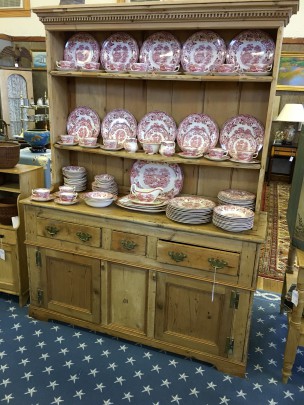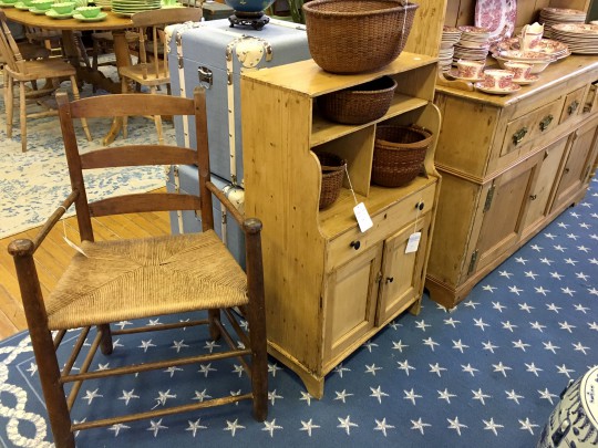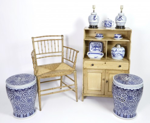 Group of Chinese Blue & White Porcelain, Faux Bamboo Chair & Pine Cupboard