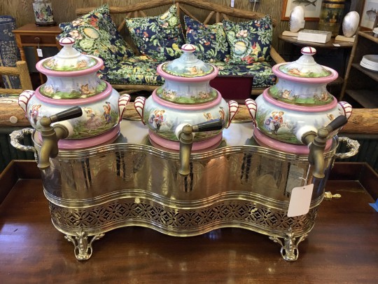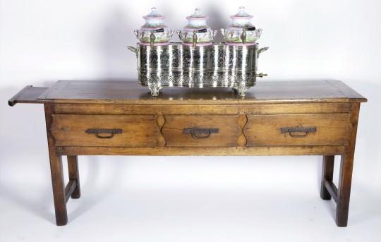 French Porcelain Brass Bain-Marie Dispenser & English Elm Country Three-Drawer Sideboard