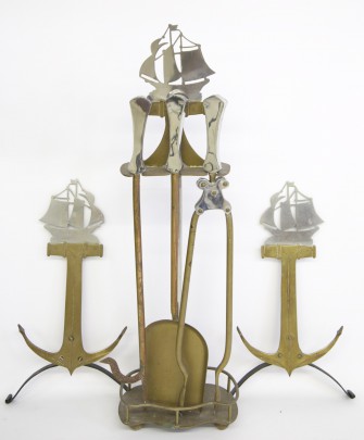 Brass and Chrome Schooner and Anchor Fire Tool Set & Andirons