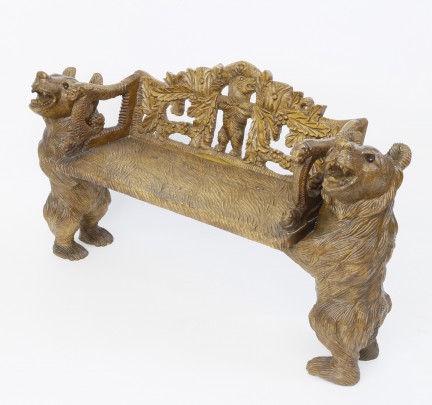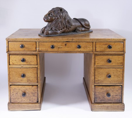 Pine Knee-Hole Desk & Folk Art Painted and Carved Wood Recumbent Lion
