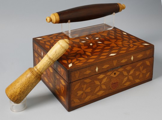19th C. Whalebone Pestle, Child’s Rolling Pin and Mariner Made Inlaid Box