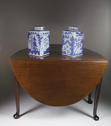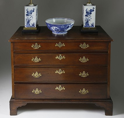 Chinese Export Blue and White Porcelain and Early George III Mahogany Chest of Drawers