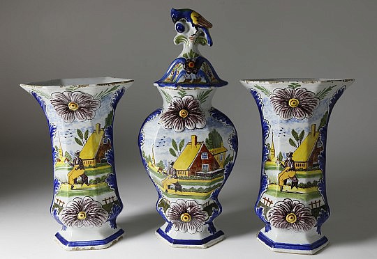 Dutch Delft Polychrome Garniture of Three Vases