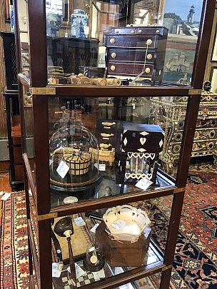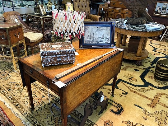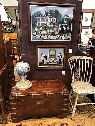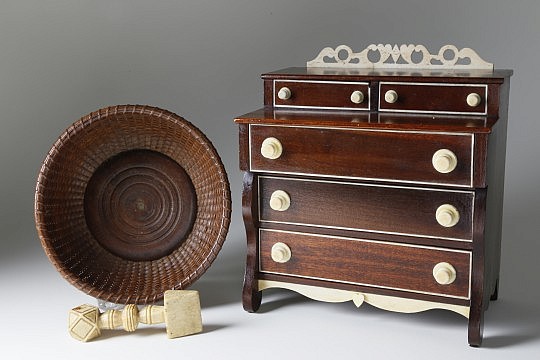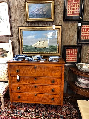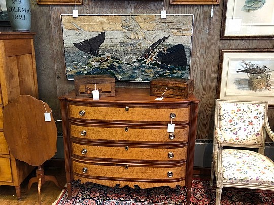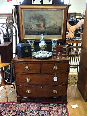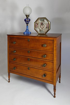 19th Century American Sheraton Chest of Drawers, Sailor’s Valentine & Sandwich Glass Lamp
