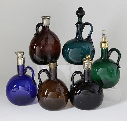 Collection of Six Hand-Blown Colored Clear Glass Decanters