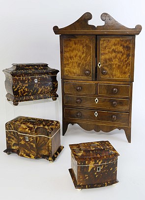 Regency Tortoiseshell Tea Caddies & Late Georgian Inlaid Miniature Mahogany Secretary