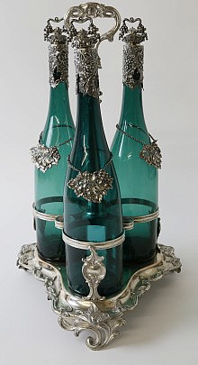 Victorian Silver-Plated Decanter Stand with Three Green Glass Bottles