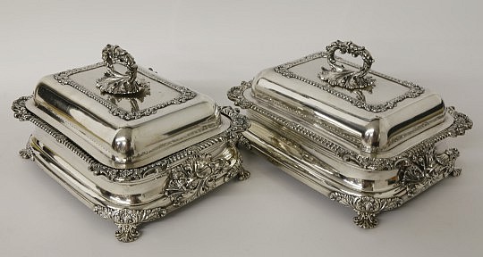 Pair of George IV Silver Plated Covered Entrée Dishes on Warming Stands