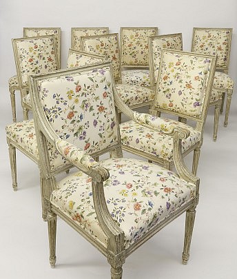Set of Ten Louis XVI Style Pale Gray Painted Beechwood Dining Chairs