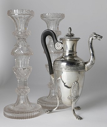 Pair of Anglo-Irish Clear Colorless Cut-Glass Candlesticks and Charles X Silver Coffee Pot