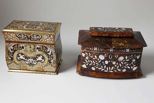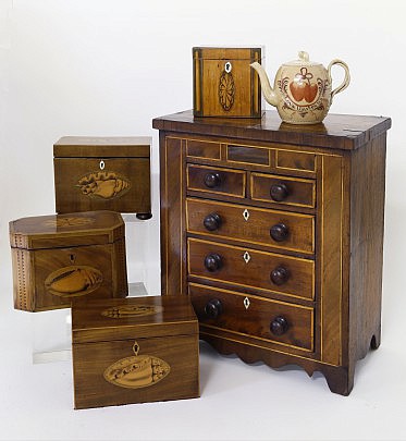 George III Marquetry Tea Caddies, Leeds Teapot & American Miniature Chest of Drawers