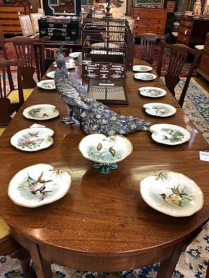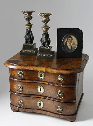 Pair of Owl Candlesticks, 19th Century Miniature Watercolor & Walnut Veneered Miniature Commode