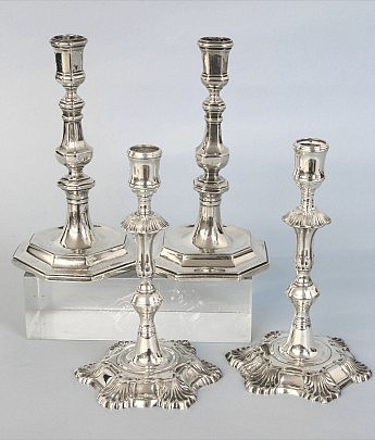 Pair of North European Cast Silver Candlesticks and Pair of George II “Paktong” Candlesticks