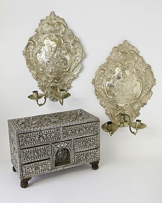 Pair of South American Silver Plated Two-Light Sconces and South American Silver Table Cabinet