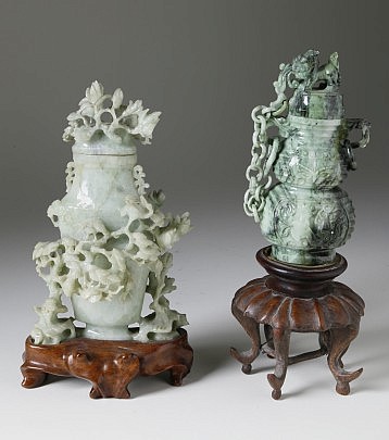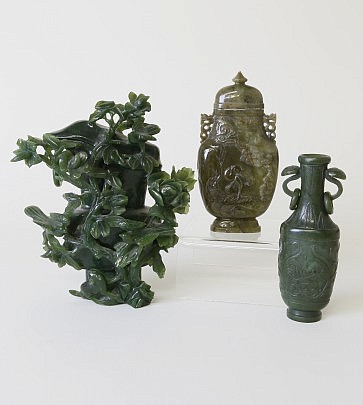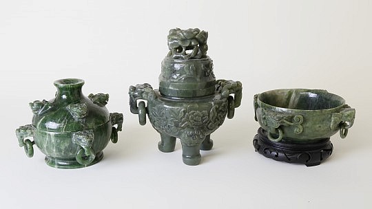 Two Qing Dynasty Chinese Green Jade Censers and Covers and Spinach Green Jade Bowl