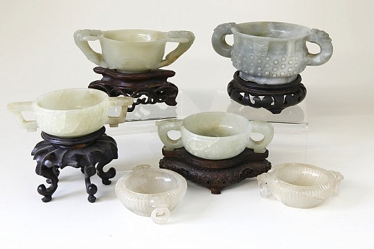 Four Qing Dynasty Celadon Jade Libation Cups and Pair of Rock Crystal Salt Cellars