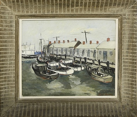 James Walter Folger Oil on Canvas Laid on Raised Door Panel “Dories on the Shore”