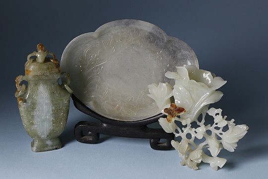 Qing Dynasty Chinese Celadon Jade Vase and Cover, Dish and Blossoming Magnolia Branch