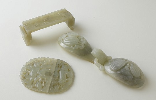 Qing Dynasty Celadon Jade Scholar’s Hand Rest and Celadon Jade Belt Buckles