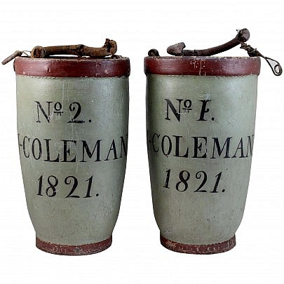 Pair of Scarce and Rare Painted Leather Fire Buckets from the Coleman Family of Nantucket, circa 1821