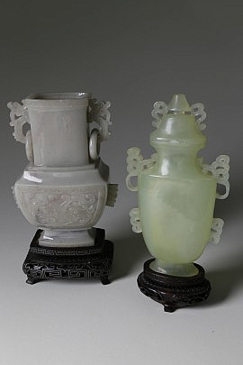 Qing Dynasty Chinese Green Jade Covered Ewer and Vases