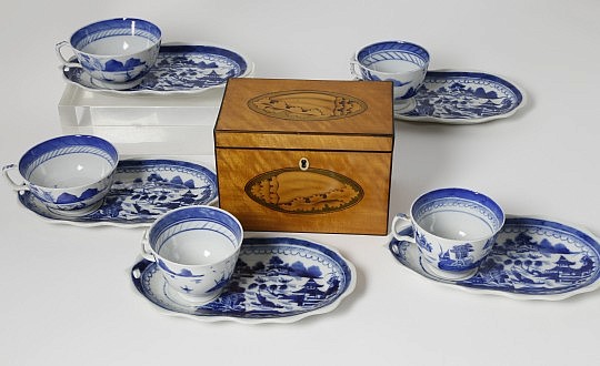 Late George III Satinwood and Marquetry Tea Caddy, Set of Five Canton Blue and White Cake Plates and Five Various Teacups