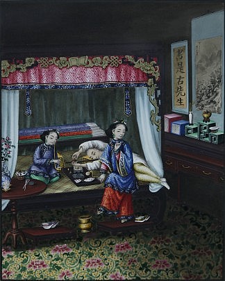 Exceptional Chinese Export Watercolor Interior Scene, Attributed to Youqua