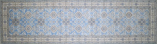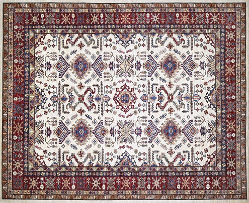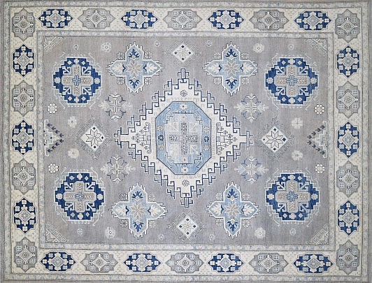 Hand Woven Cobalt Blue, Taupe, and Ivory Kazak Rug