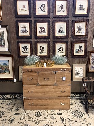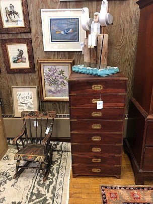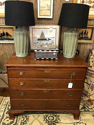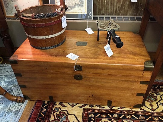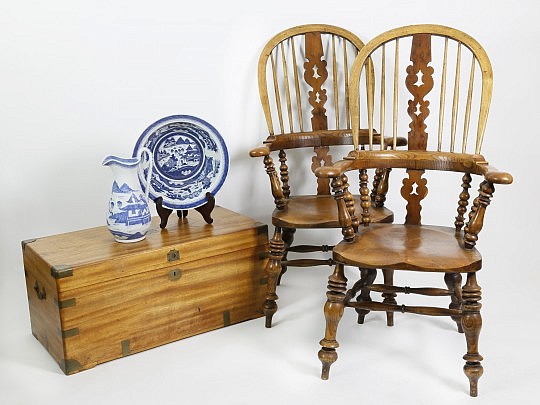 19th Century Camphorwood Trunk, Windsor Chairs, and Water Pitcher and Basin