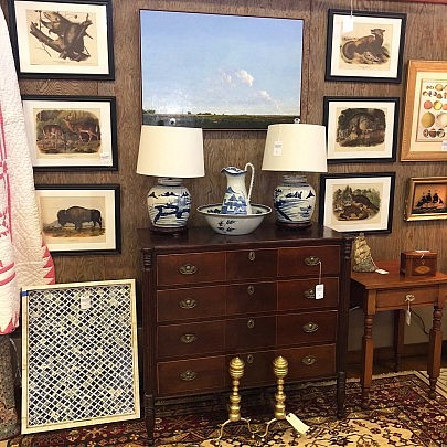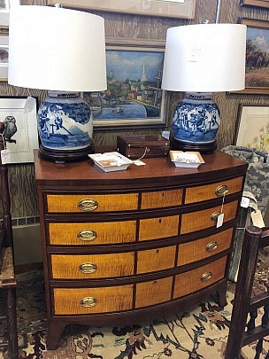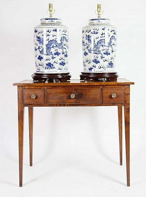 Tiger Maple Hepplewhite Three-Drawer Server with Pair of Blue and White Lamps