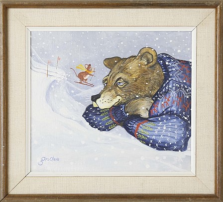 George Davis Oil on Board “Ski Scene with Mouse and a Bear Wearing a Ski Sweater”