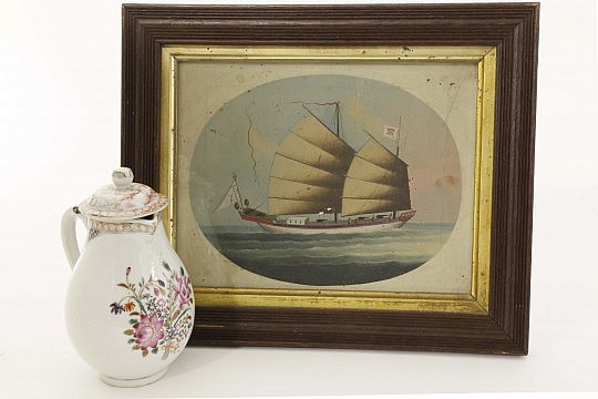 Chinese Export Oil on Linen Portrait of a Mandarin Junk