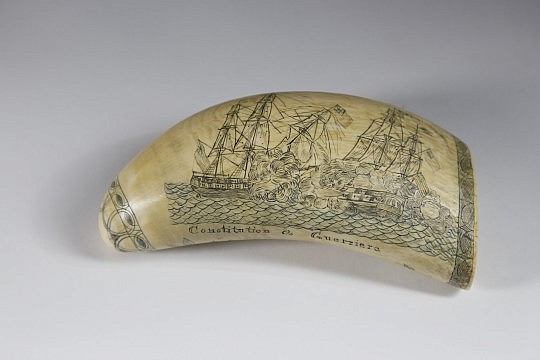 Whaleman Scrimshaw and Polychromed Sperm Whale Tooth, Naval Engagement of the Constitution and the Guerriere, 1st Quarter of the 19th C.