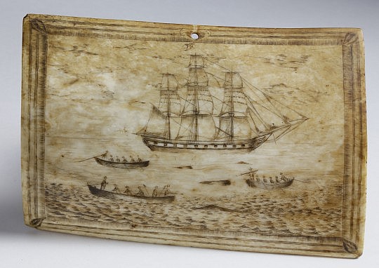 Whaleman Scrimshaw Pictorial Panbone Plaque, circa 1840