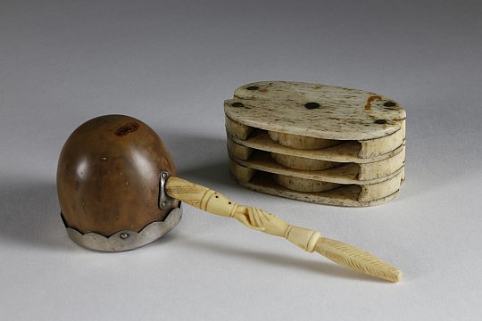 Whaleman Made Ivory, Silver and Nutshell Friendship Rum Ladle, circa 1840 and Whalebone Triple Block, circa 1850