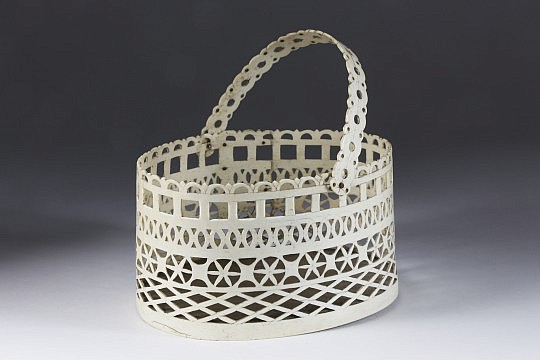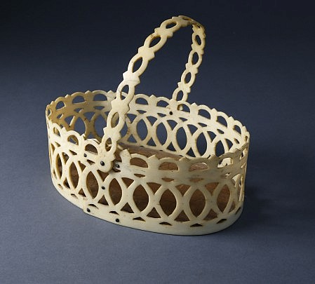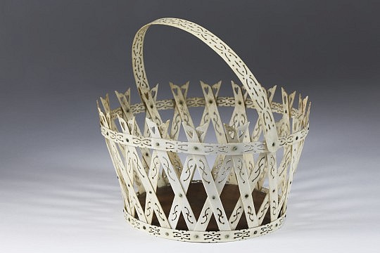 Whaleman Made Nantucket Pierced Lower Panbone Swing Handle Scrimshaw Basket, circa 1850