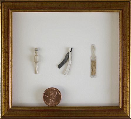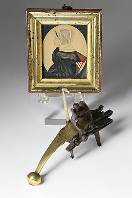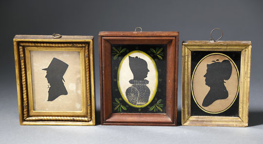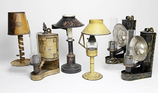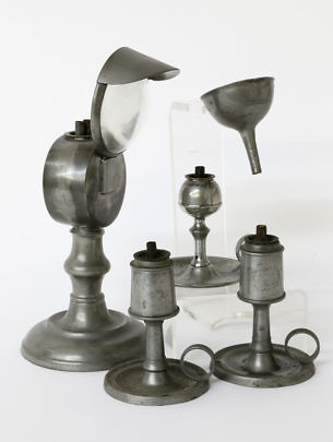 Two Miniature American Pewter Whale Oil Courting Lamps and Rufus Porter Miniature Watercolor Profile Portrait of a Gentleman