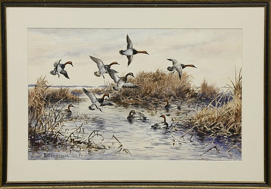 Roland Clark Watercolor on Paper “Canvasback Ducks Landing in the Marsh”
