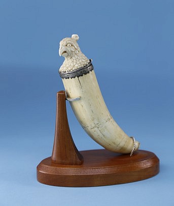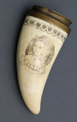 Scarce Carved Horn and Whale Ivory Scrimshaw Powder Flask, circa 1800