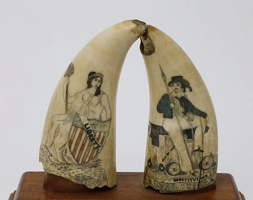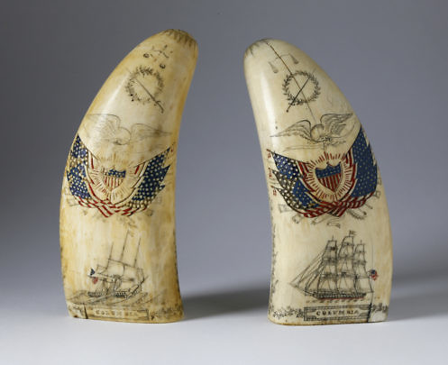 Fine Pair of Patriotic Wax Engraver Scrimshawed Sperm Whale Teeth