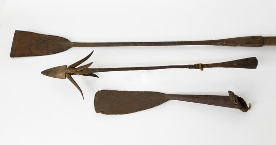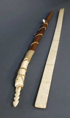 Eskimo Walrus Ivory and Wood Fishing Harpoon and Whale Oil Barrel Whalebone Measuring Stick