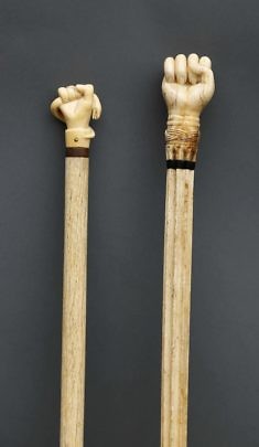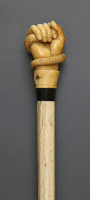 Whaler Carved Whale Ivory Fist and Serpent Walking Stick and Whale Ivory and Whalebone Carved Fist Knob Walking Stick