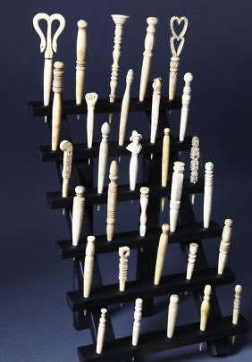 Fine Group of 30 Whaler Made Whale Ivory and Whalebone Carved Inlaid Bodkins