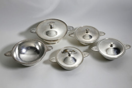 Group Of Five Christofle, Ercuis and Blanc French Silver Plate Covered Nautical Decorated Tureens
