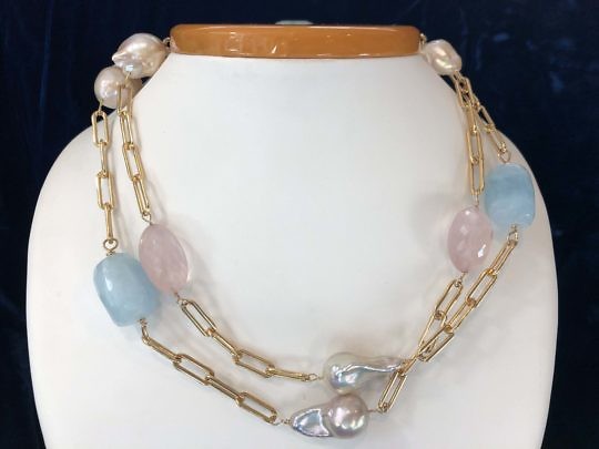 Aquamarine, Rose Quartz and Baroque Fresh Water Pearl Necklace