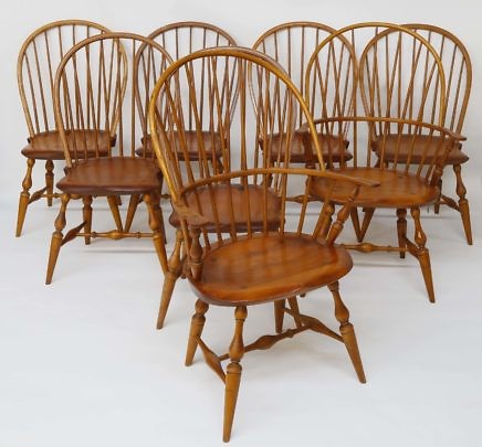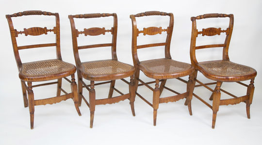 Set of Four New York Strong Tiger Maple Caned Seat Dining Chairs, circa 1820