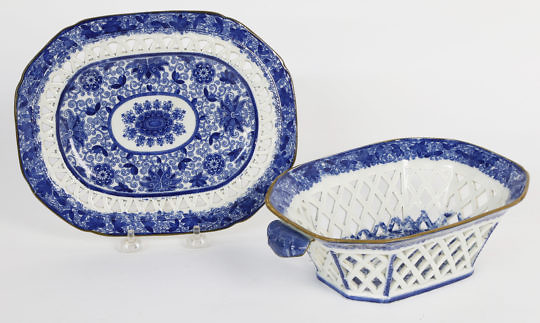 English Blue and White Soft Paste Transferware Chestnut Basket and Underplate, circa 1800