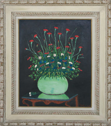 Jean Busquets Oil on Canvas “Red Dianthus in Green Bowl Still Life”